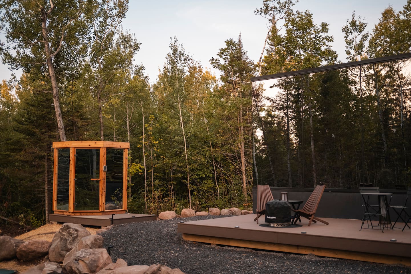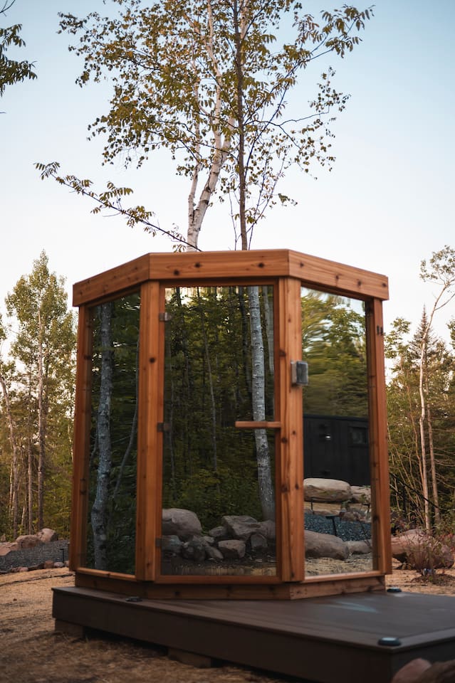 Step into a unique architectural retreat with ceiling-to-floor windows and 360° panoramic views - designed for couples and nature lovers, perfect for your North Shore adventures. ✅Private sauna ✅Private deck ✅Solo stove fire pit ✅2 mins to slopes, winery & golf ✅3 mins to Lake Superior ✅Endless hikes and adventure 🌲✨220 sq ft of cozy, modern comfort ⚠️Our cabin is pet-free, non-smoking, and for double occupancy ⚠️Please take a moment to review the ‘Other details to note’ section at the end